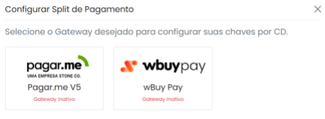 Observação: No momento só estão disponíveis para Split de Pagamento os gateways Pagar.me e wBuy Pay.