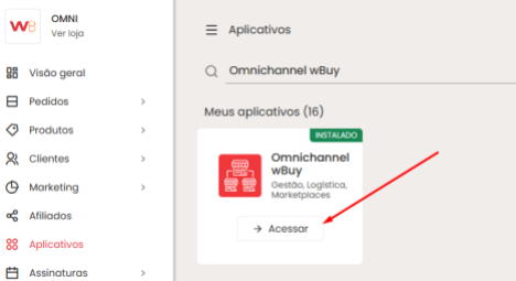Ao criar sua conta no nosso Omni Channel, você terá acesso às configurações básicas do Omni em Aplicativos > Omnichannel wBuy. Clique em Acessar para começar a configurar.