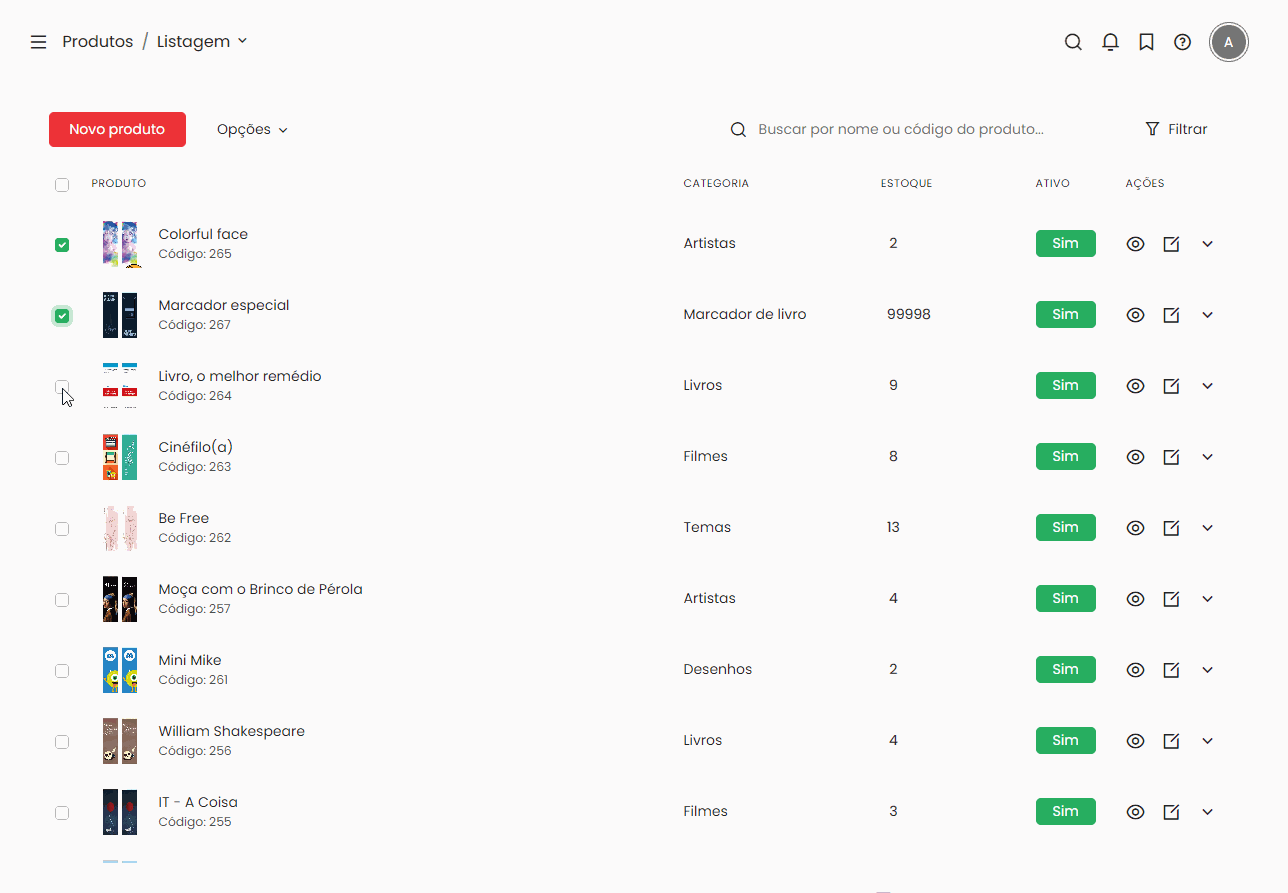 Ou você pode fazer em massa, na listagem de produtos selecione quais produtos deseja, no rodapé clique em Ações em massa e escolha a opção de Permitir/Negar uploads de arquivo