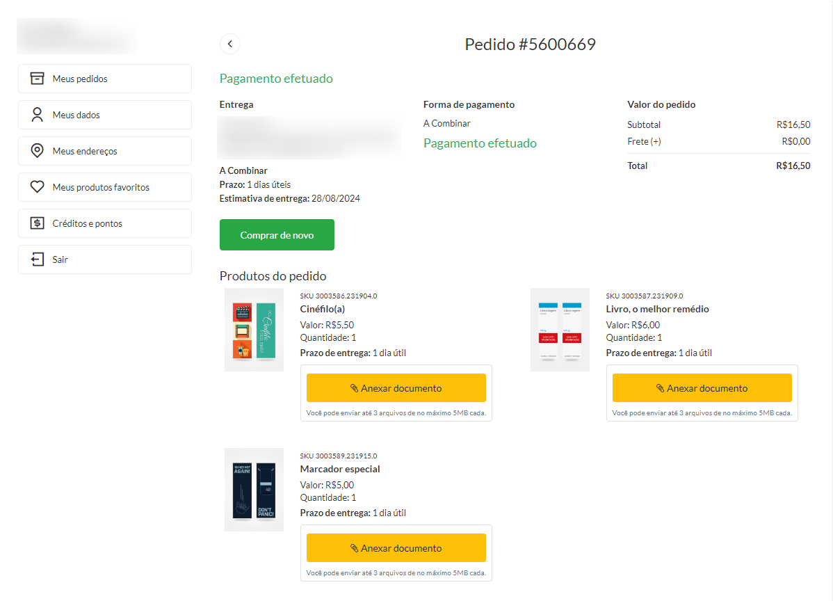 Agora o cliente que escolher um ou mas produtos que tenha essa opção e o pedido esteja pago para cada item será aberto nos detalhes do pedido do cliente a opção de anexar um arquivo, conforma exemplo abaixo: