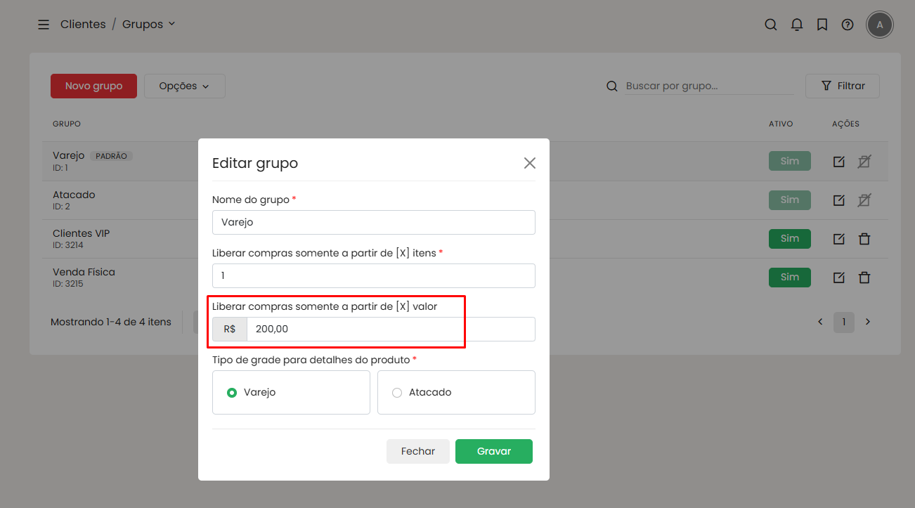 - Para este exemplo, vamos definir um valor mínimo de compra de R$ 200,00 para o grupo padrão Varejo