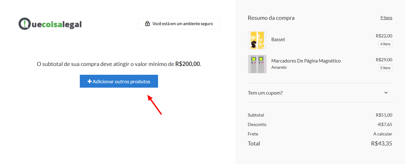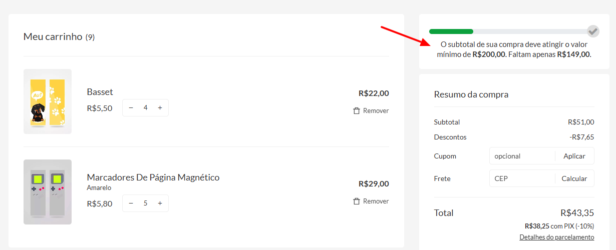 Montei um carrinho com um valor inferior a R$ 200,00. Observe que uma mensagem aparece informando que ainda faltam R$ 149,00 para atingir o mínimo exigido. Essa mensagem leva em consideração o subtotal do carrinho: