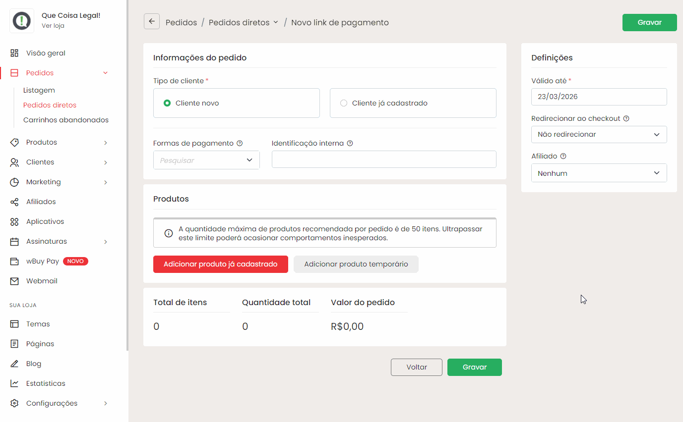 - Validade do pré-pedido: define até quando o link poderá ser utilizado