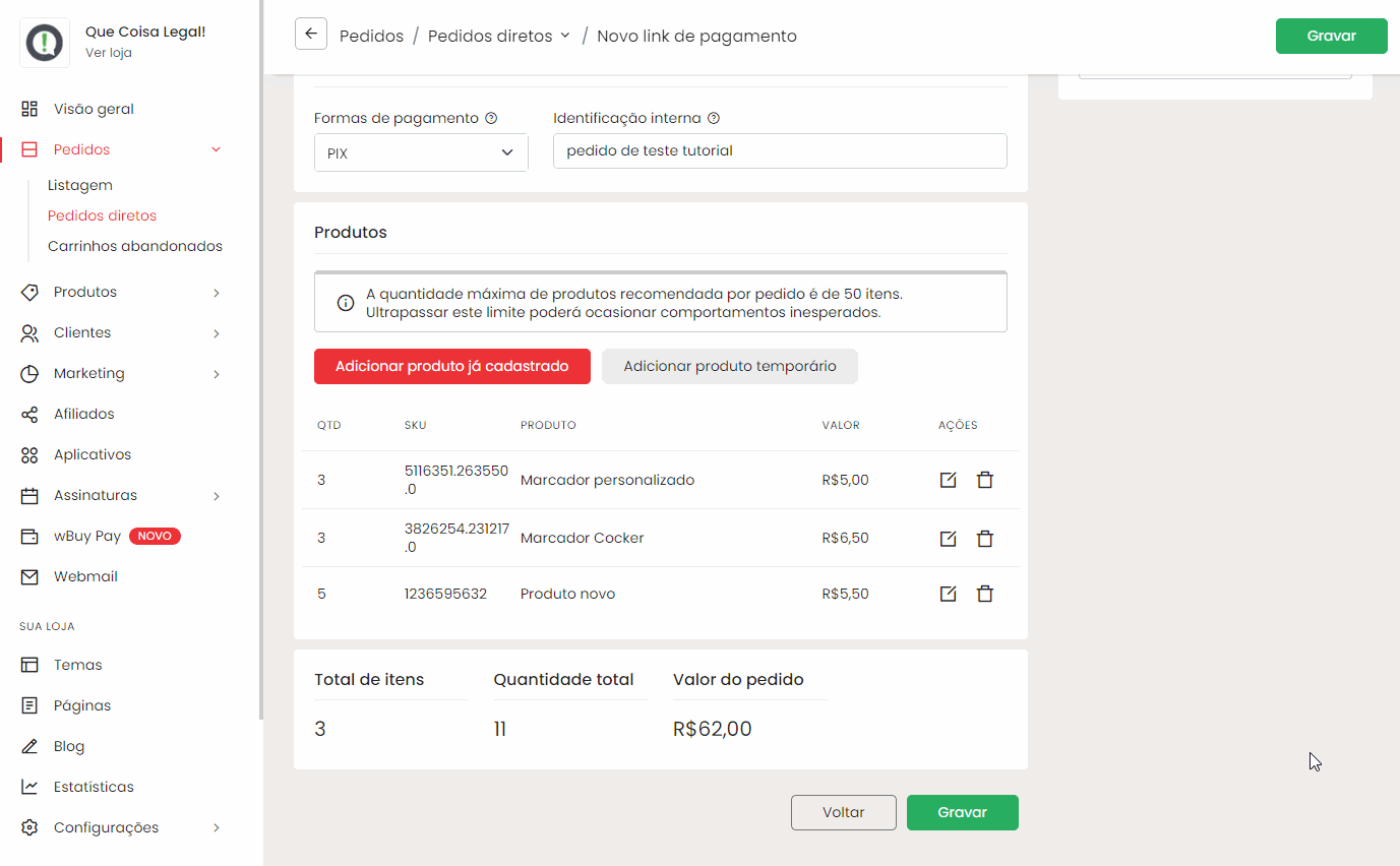 - Identificação interna (opcional): um nome ou código para facilitar a identificação do pedido