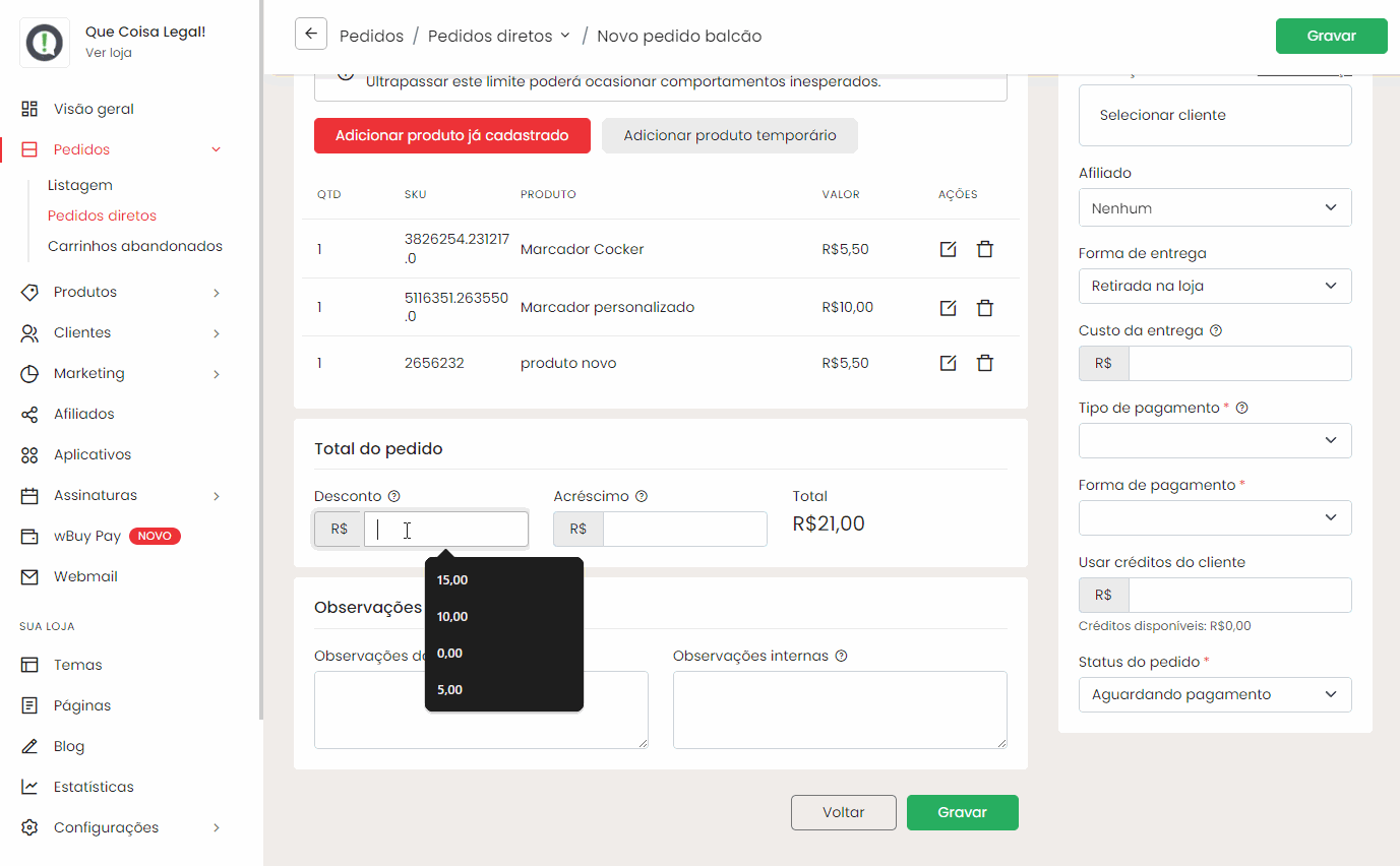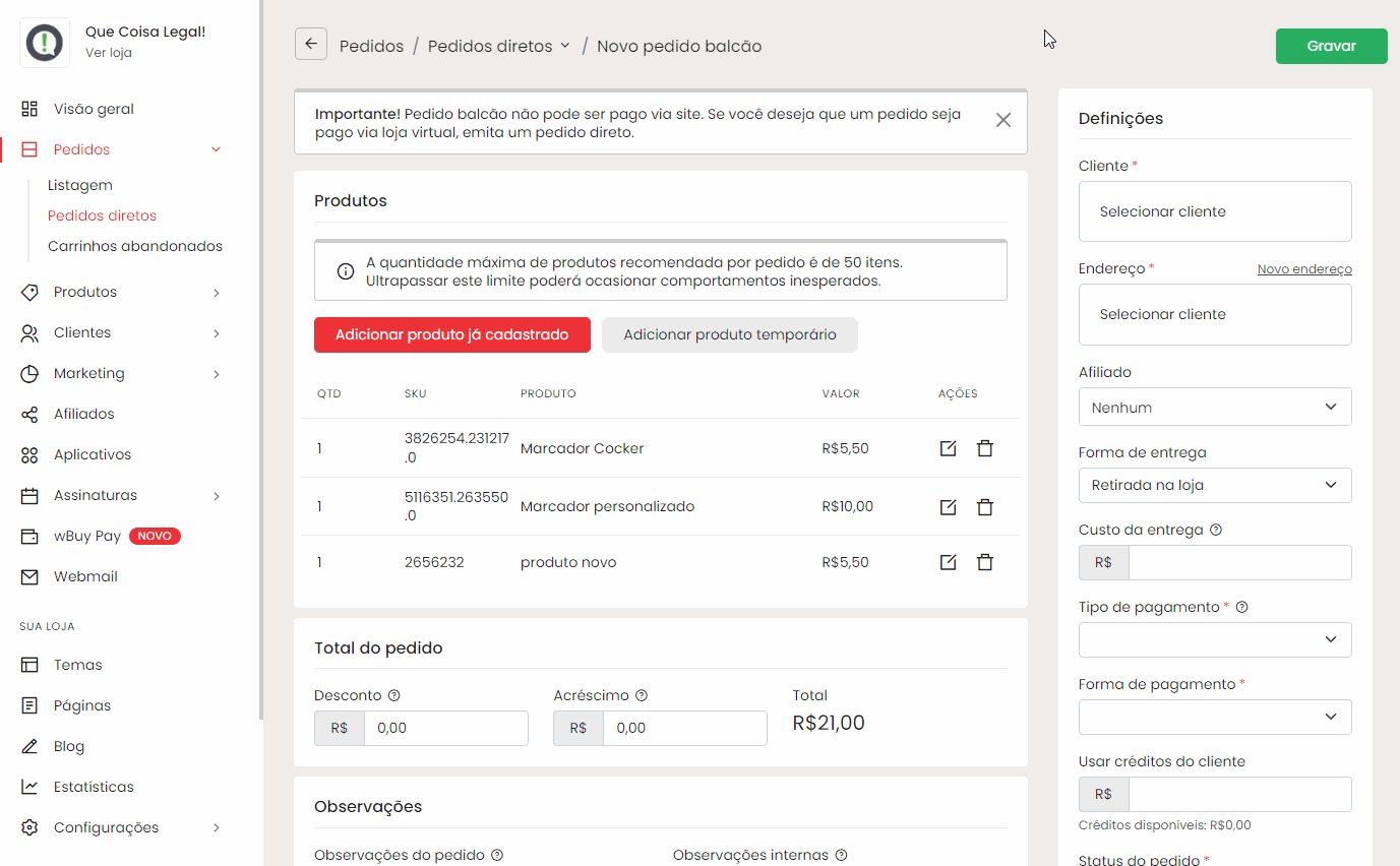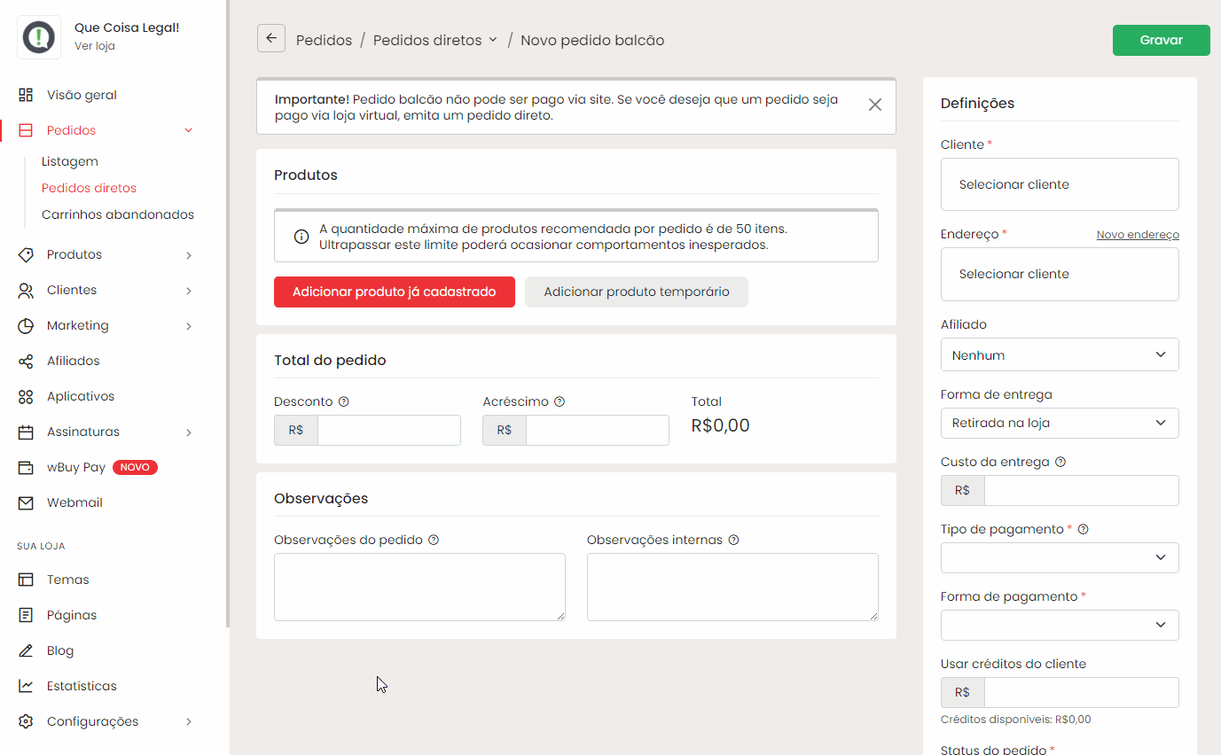 Neste tutorial, vamos mostrar como criar pedidos diretos na sua loja utilizando duas opções: