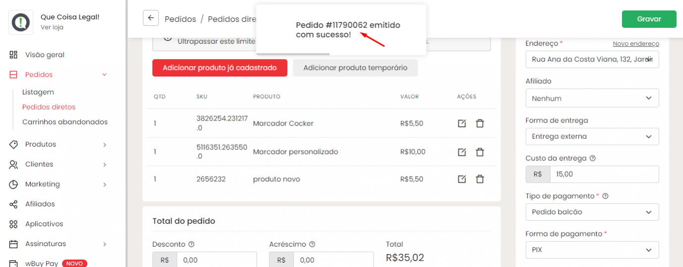 Após preencher tudo, clique em Salvar pedido.