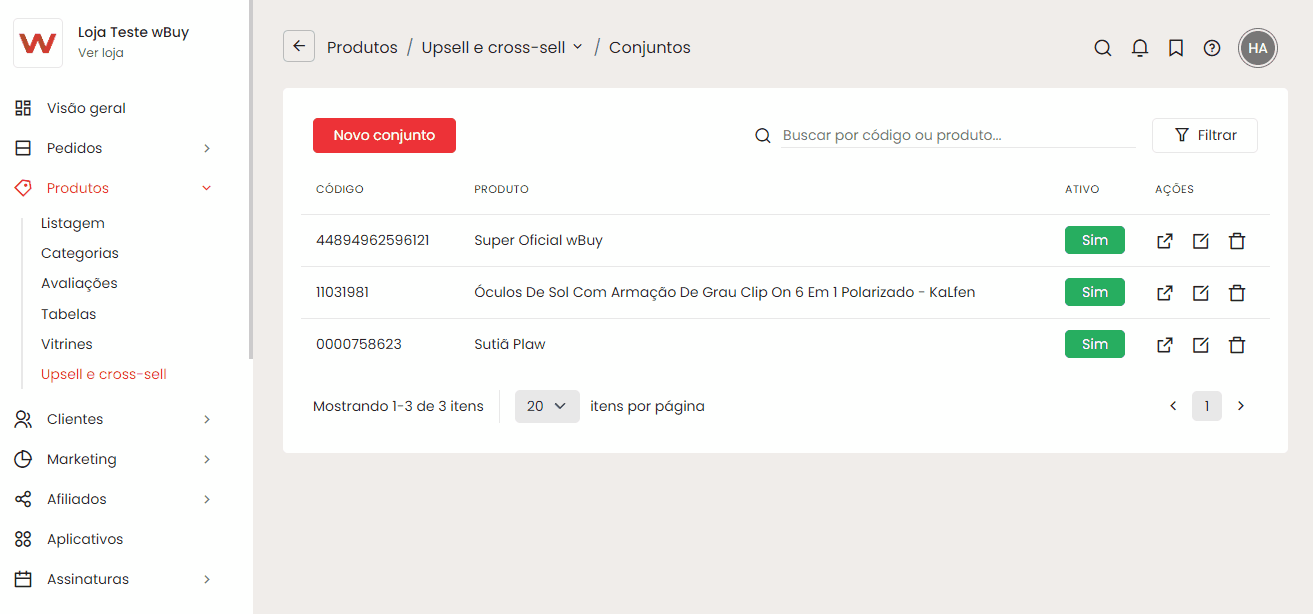No seu painel, acesse Produtos > Upsell e cross-sell, localize a opção Conjunto, clique em Configurar e, em seguida, selecione Novo Conjunto.