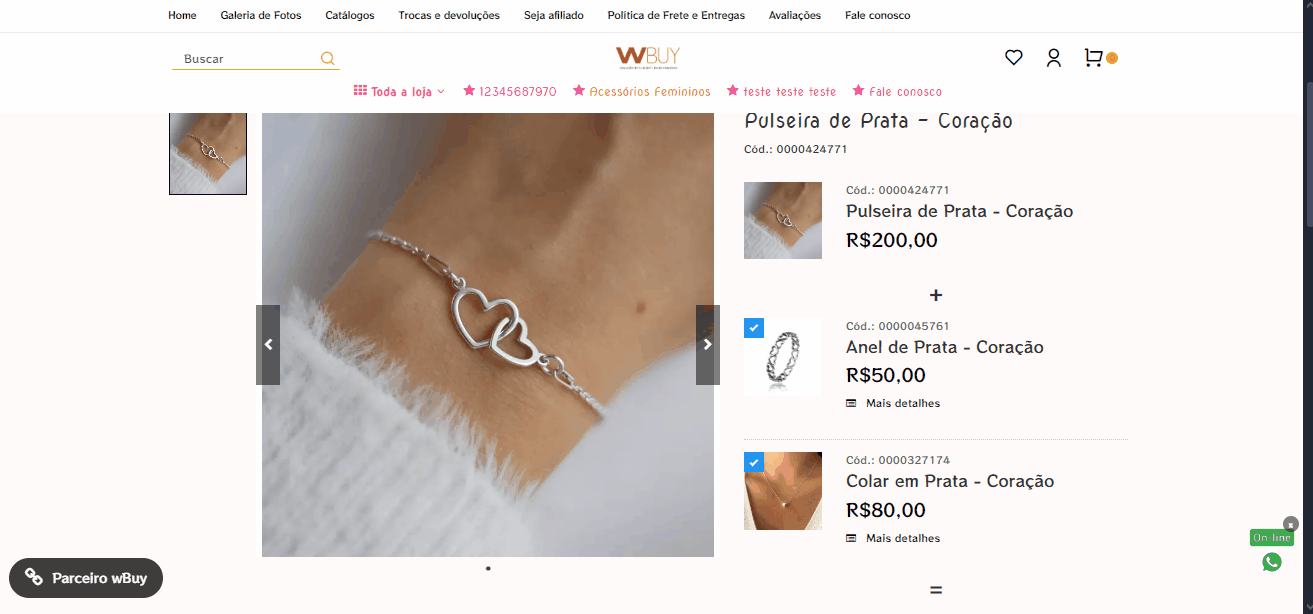 Nos detalhes do produto principal, seu cliente poderá selecionar para o carrinho os produtos adicionais que fazem parte do conjunto.