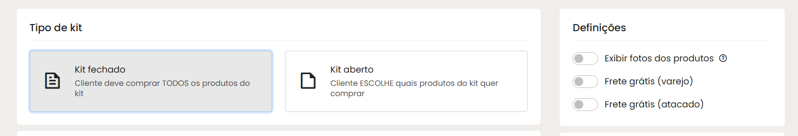 No campo Tipo de Kit, você deverá definir se o kit será fechado ou aberto: