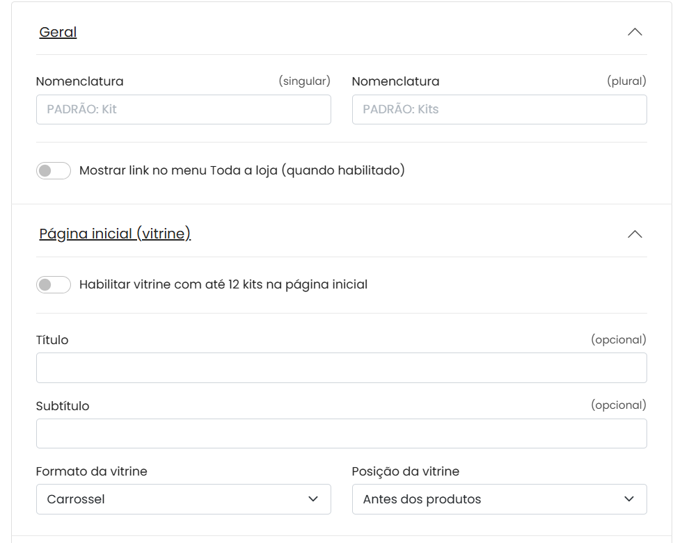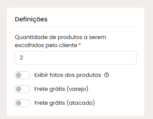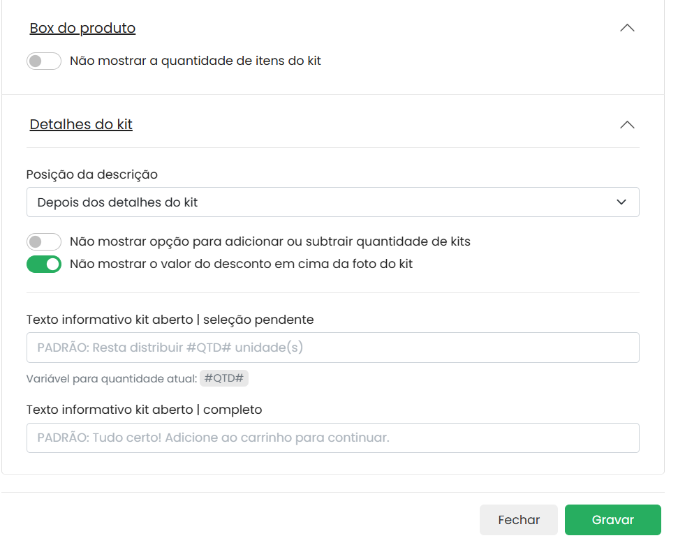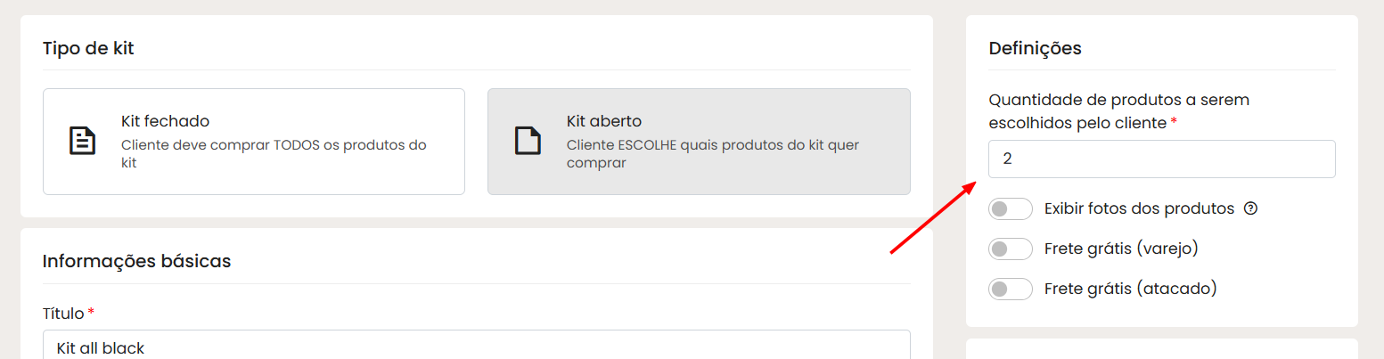 - Kit aberto: permite que você determine quantos itens do kit o cliente deverá selecionar para concluir a compra. (Por exemplo: se o kit possui 3 peças, mas você deseja que o cliente compre no máximo 2, basta configurar essa quantidade na tela ao lado).