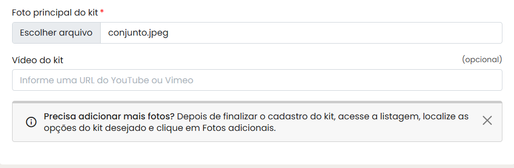 Na sequência envie uma foto do kit e, caso queira, adicione a URL de um vídeo para ser inserido na página do kit.