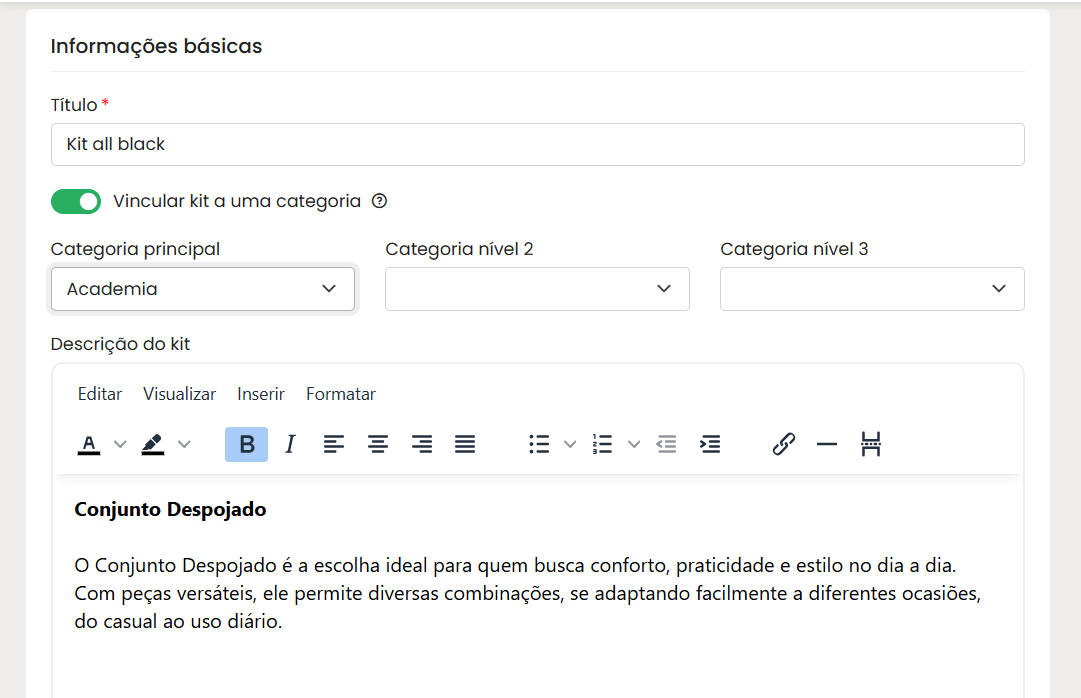 Na tela de cadastro preencha as informações básicas do kit.