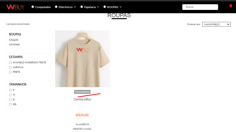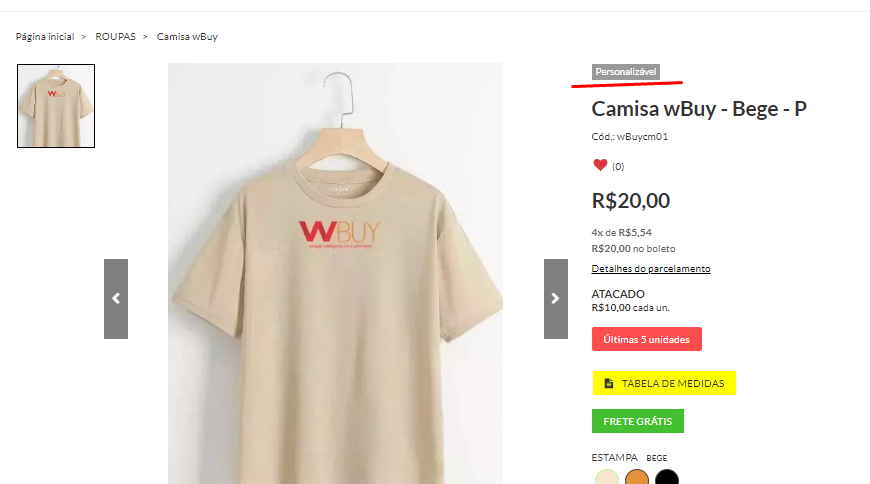 Na página do seu produto a opção de personalizador aparecerá, substituindo o "Adicionar ao carrinho" padrão