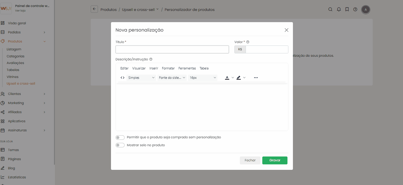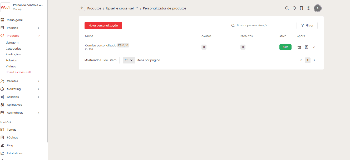 Para criação da personalização, acesse Produtos > Upsell e Cross-sell > Personalizador de Produtos > Nova personalização